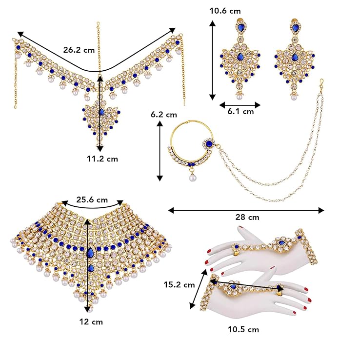 DIMENSIONS: Necklace Length: 25.6 cm X Width: 12 cm; Earrings Length: 10.6 cm X Width: 6.1 cm; Nose Pin Ring-28 cm X 6.2 cm; Haath Panja Length: 15.2 cm X Width: 10.5 cm; Matha Patti Length: 26.2 cm X Width: 11.2 cm; Weight: 570 Grams